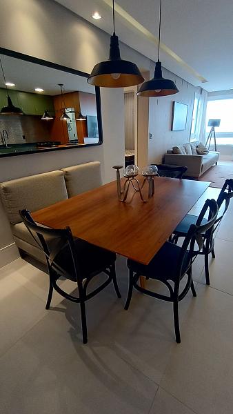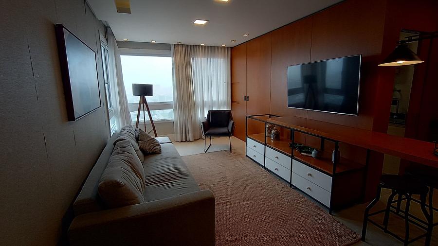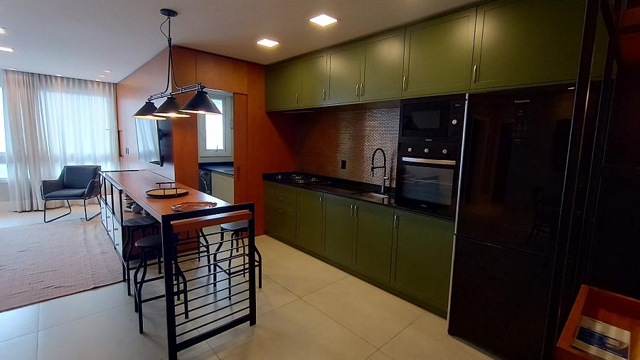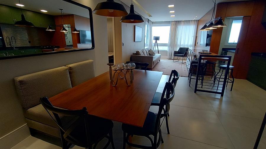 A sala de estar, integrada com a sala de jantar e a cozinha, forma um espaço moderno e convidativo, perfeito para curtir bons momentos a dois ou entre amigos. Climatizado e pensado nos mínimos detalhes, o ambiente combina funcionalidade com elegância, criando uma atmosfera leve e acolhedora.