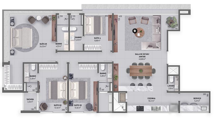 Ed. L'art é um empreendimento com 9.500 m² de área construída, distribuídos em 34 apartamentos que variam de 186 a 342 m² de área privativa, mais um rooftop com: piscina, terraço, espaço gourmet, living, espaço do fogo, open fitness, entre outros.
