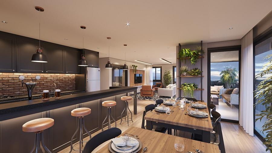Inspirado nas residências inglesas e em seus clássicos elementos, compõe a fachada o consagra do revestimento red brick (tijolo vermelho) e gradil preto frontal, o projeto coloca-se em harmonia ao estilo contemporâneo com linhashorizontais e madeira.