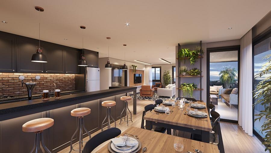 Inspirado nas residências inglesas e em seus clássicos elementos, compõe a fachada o consagra do revestimento red brick (tijolo vermelho) e gradil preto frontal, o projeto coloca-se em harmonia ao estilo contemporâneo com linhashorizontais e madeira.