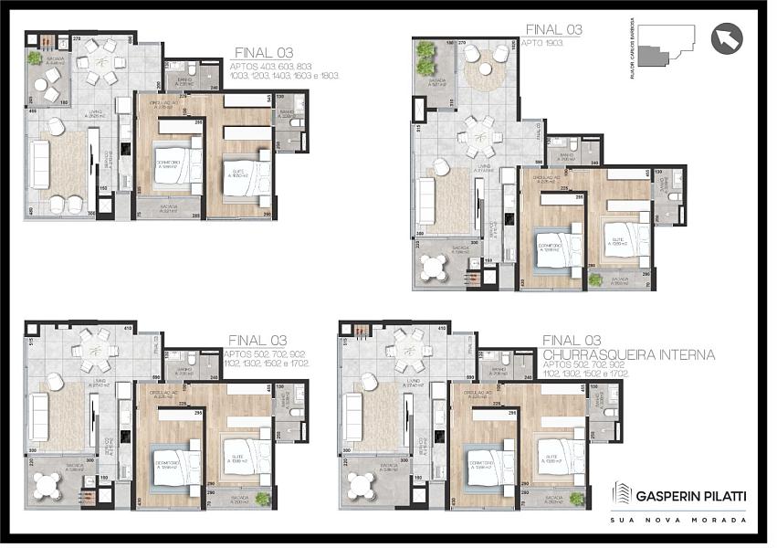Apartamentos amplos de 78m² a 102m², de 2 e 3 dormitórios com suíte, além de guarda-volumes no andar do apartamento, diferencial imprescindível para um apartamento na praia, onde pode ser depositado guarda-sol, cadeiras, entre outros apetrechos da família