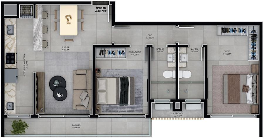 O apartamento de dois dormitórios, sendo uma suíte, tem um living acolhedor e uma vista que inspira. A integração dos ambientes valoriza a luz natural e torna cada espaço ainda mais especial, ideal para quem quer viver com tranquilidade sem abrir mão da funcionalidade.