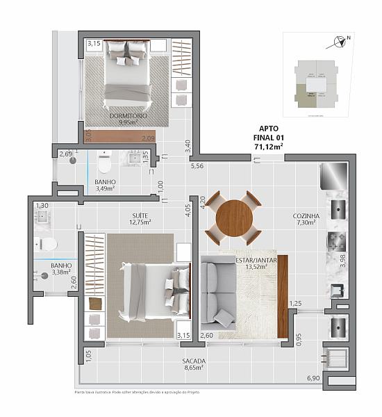 Os apartamentos contam com 2 dormitórios, incluindo uma suíte, além de sala e cozinha integradas, perfeitas para o convívio em família. A sacada aberta com churrasqueira e espera para pia convida a aproveitar cada momento ao ar livre, enquanto os banheiros com ventilação natural garantem conforto e bem-estar. Cada detalhe foi cuidadosamente planejado: aberturas amplas em alumínio preto, acabamentos em porcelanato acetinado, massa corrida nas paredes e teto em gesso liso. Há esperas para água quente e ar-condicionado, além de área técnica exclusiva para os equipamentos.