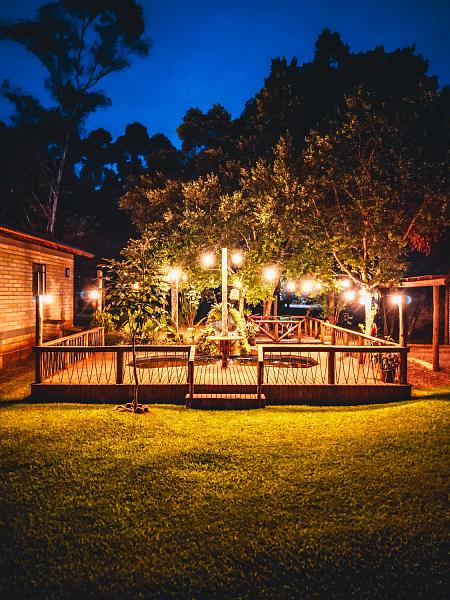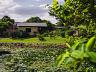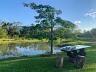 Conta com lago de criação de peixes e pesca exportiva, lago artificial com carpas coloridas e ao seu redor deck com mesa e roda d'água.