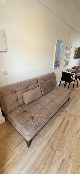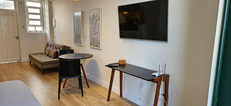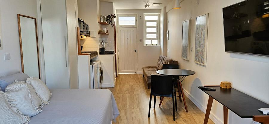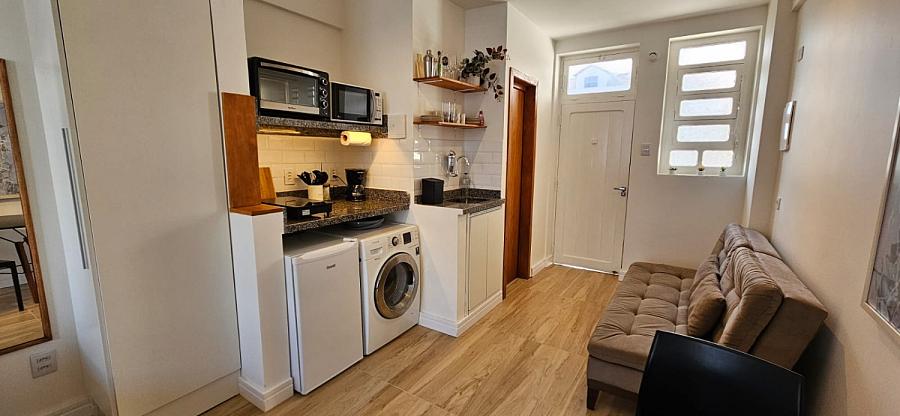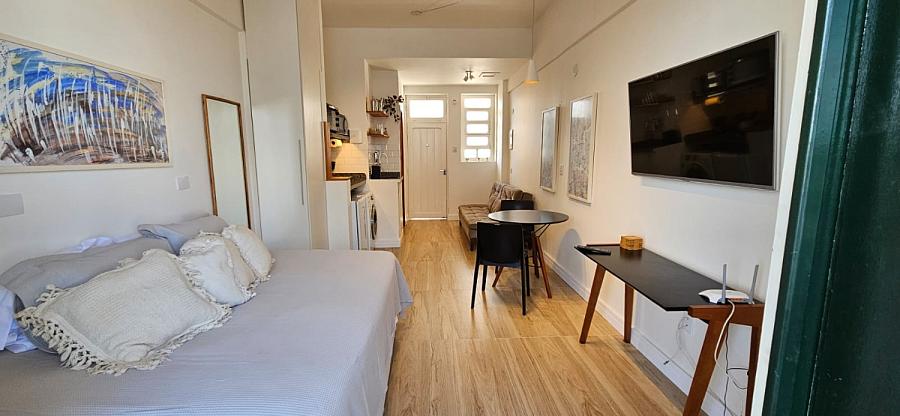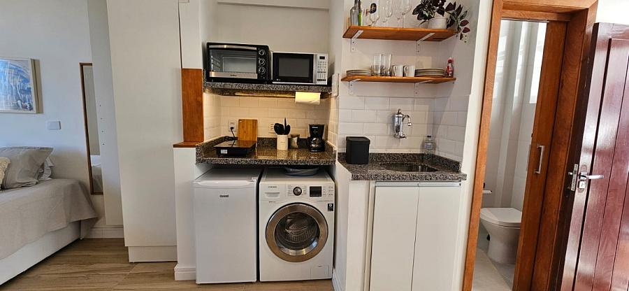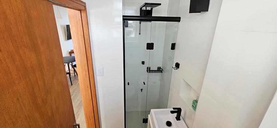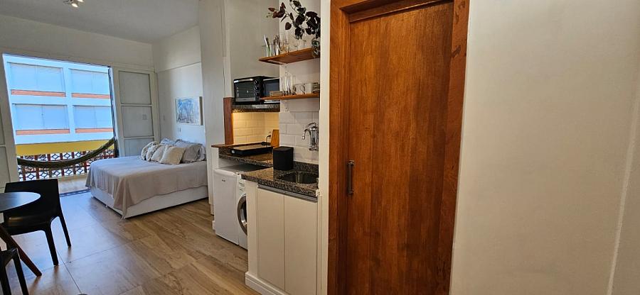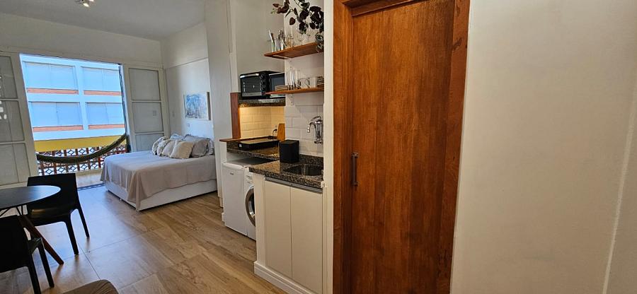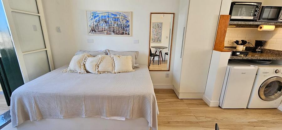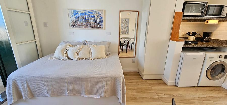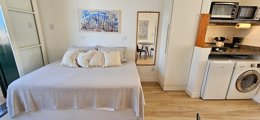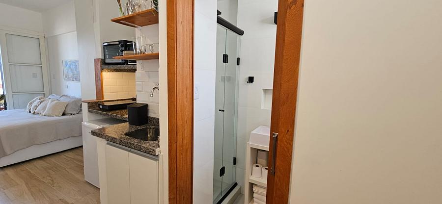 Ao adentrar este espaço harmonioso, somos envolvidos pelo aconchego de um ambiente mobiliado e equipado com requinte e bom gosto. A sacada, um convite ao relaxamento e à contemplação, se torna o cenário perfeito para aqueles momentos de pausa e reflexão. E o banheiro social, um santuário de tranquilidade e cuidado pessoal, completa esta experiência sensorial que é viver à beira-mar. Este studio não é apenas uma moradia, é um portal para um estilo de vida onde o mar é o protagonista, e cada dia é uma nova página de uma história repleta de beleza e inspiração.